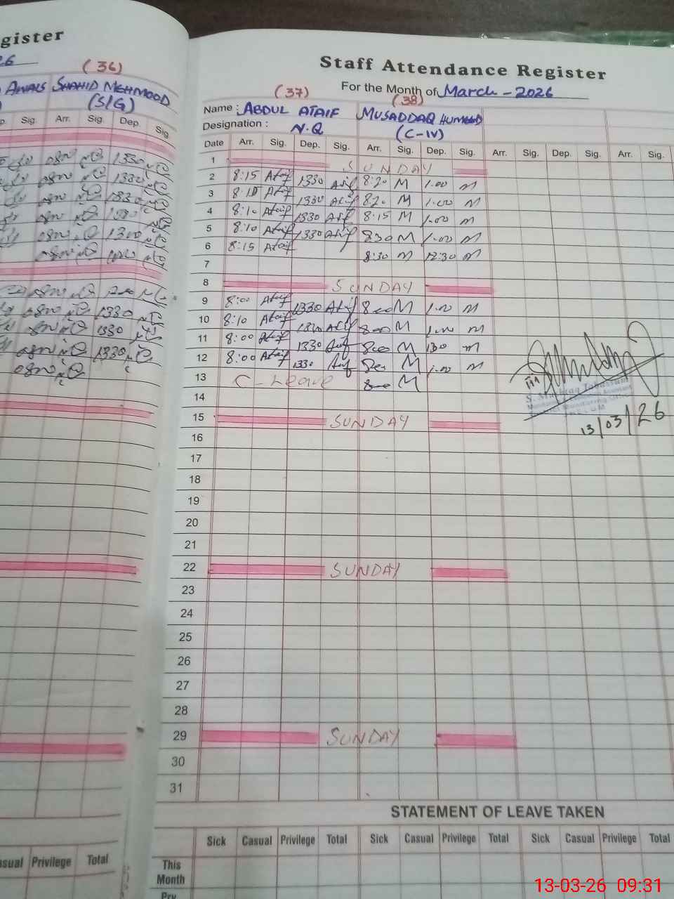 | CNIC | Full Name | Designation | R/C | Absence During Last Calender Month |