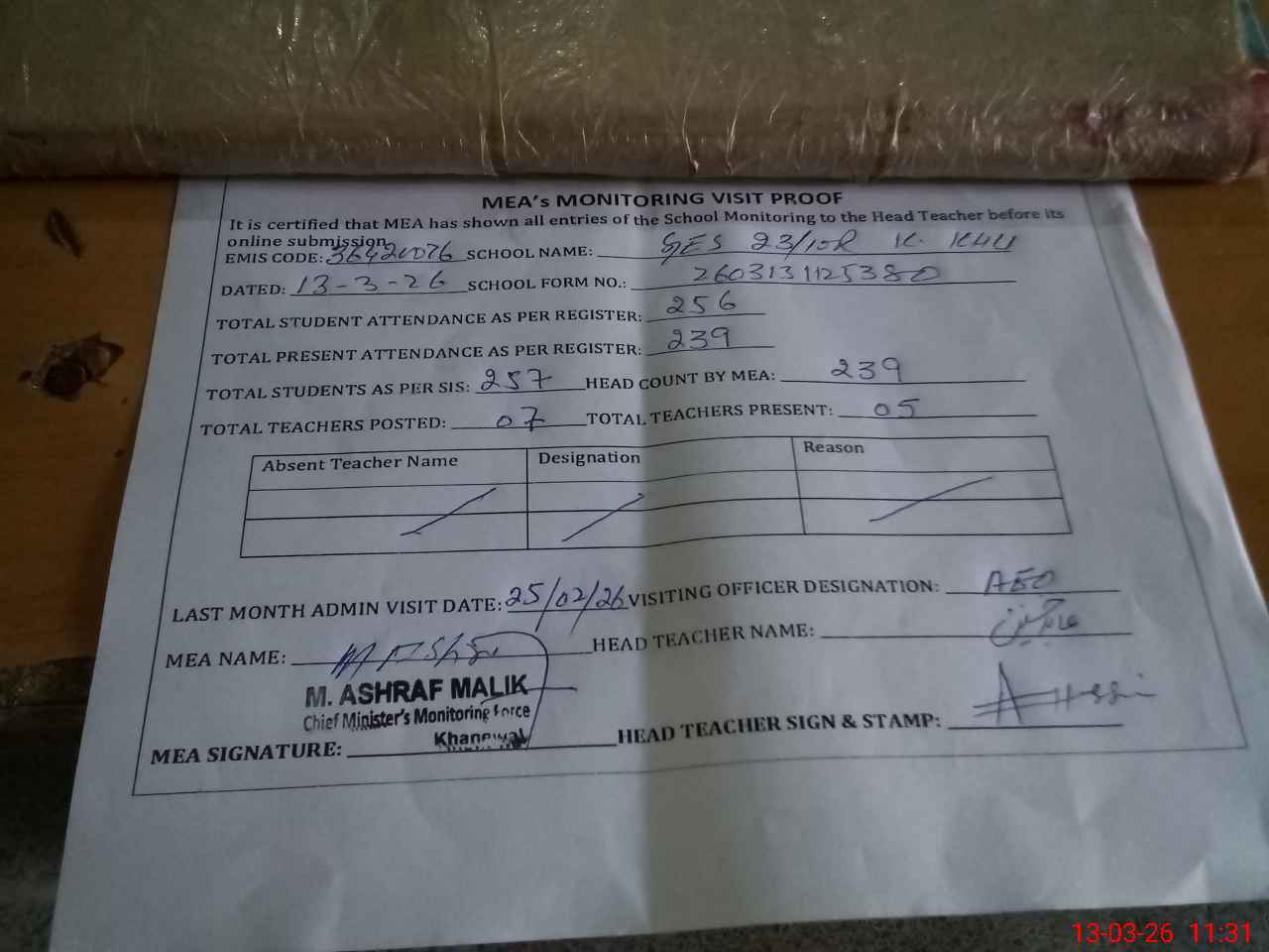 | Attendance Register | Head Teacher | MEA with School | Visit Proof |