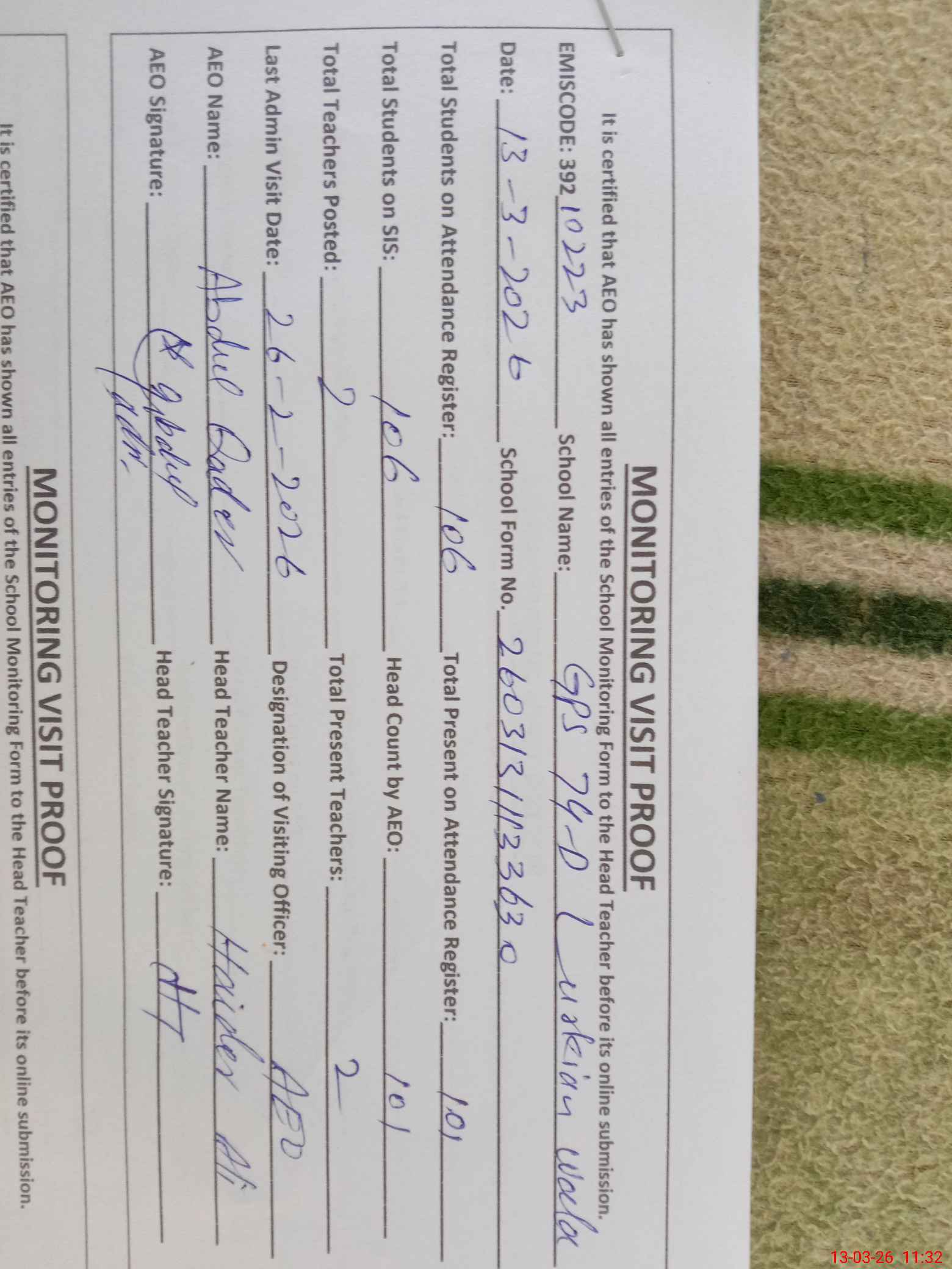 | EMIS Code: 39210223 | Name of School: GPS 74 D LURKIAN WALA | |||