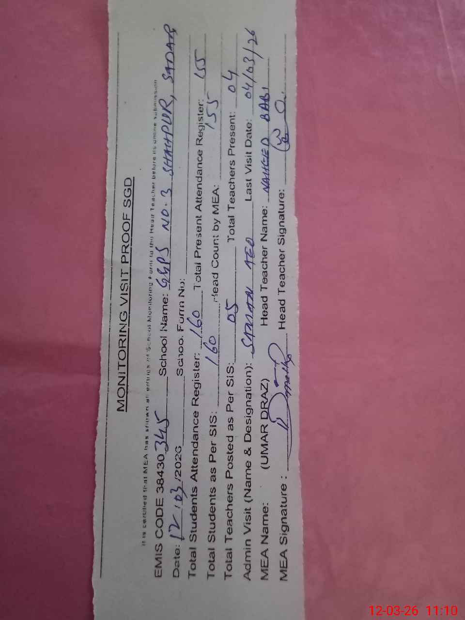 | Attendance Register | Head Teacher | MEA with School | Visit Proof |