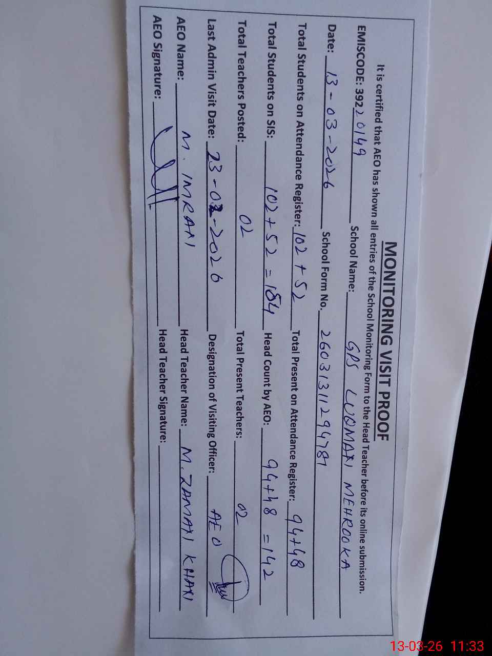 | EMIS Code: 39220149 | Name of School: GPS LUQMAN MEHRO KA | |||