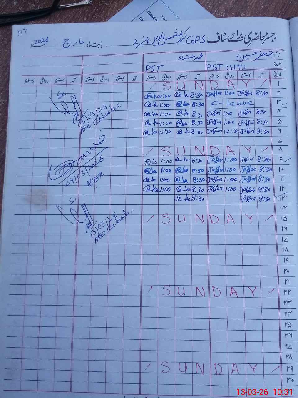 | CNIC | Full Name | Designation | R/C | Absence During Last Calender Month |