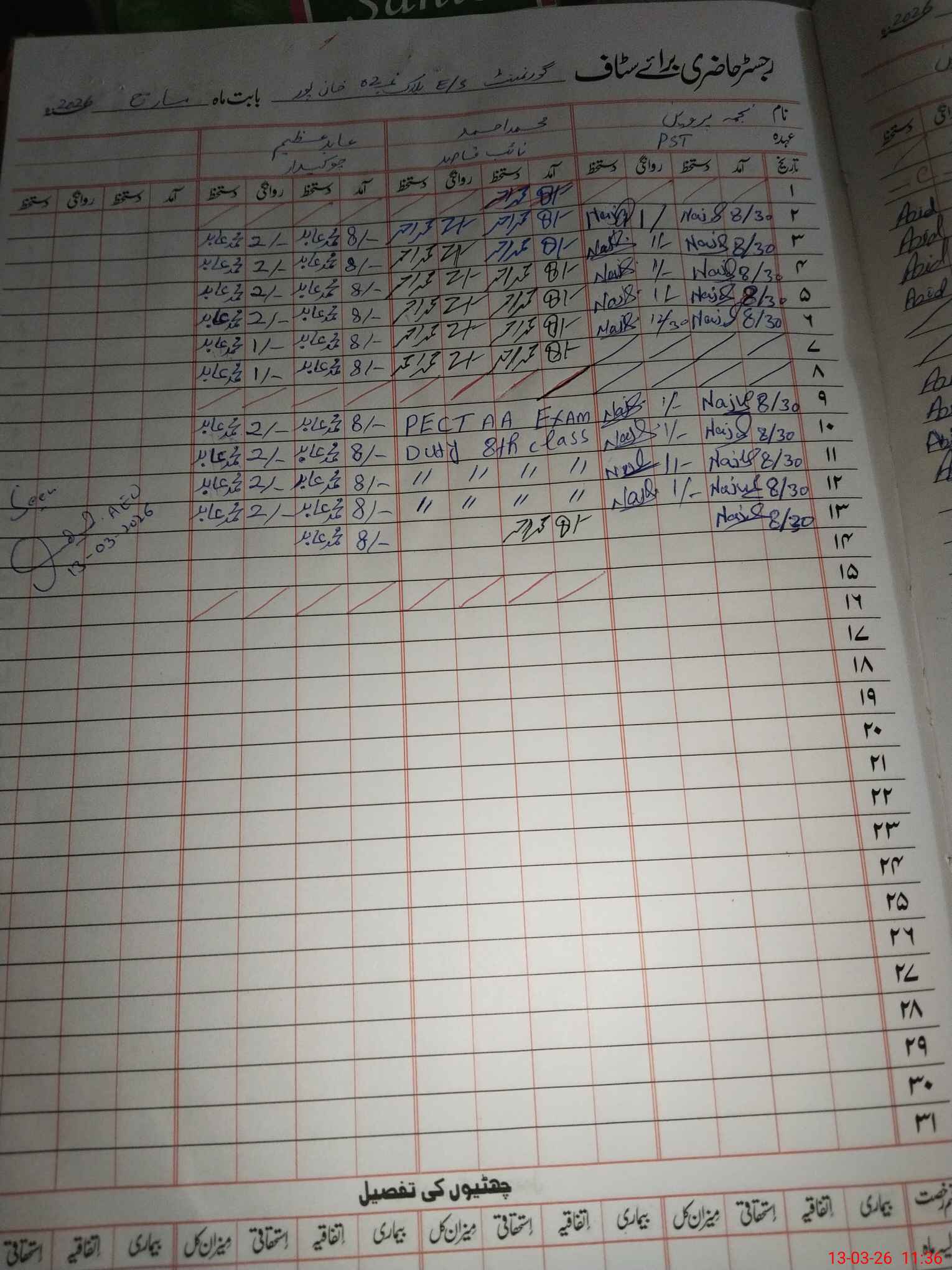 | CNIC | Full Name | Designation | R/C | Absence During Last Calender Month |