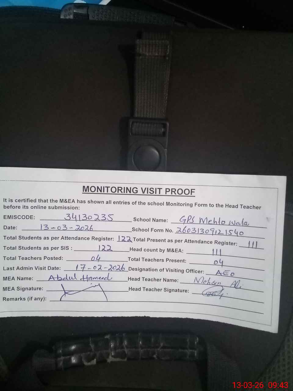 | Attendance Register | Head Teacher | MEA with School | Visit Proof |