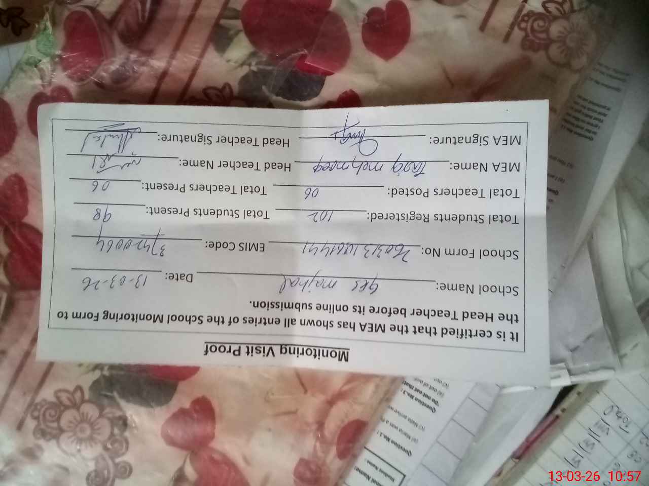 | Attendance Register | Head Teacher | MEA with School | Visit Proof |