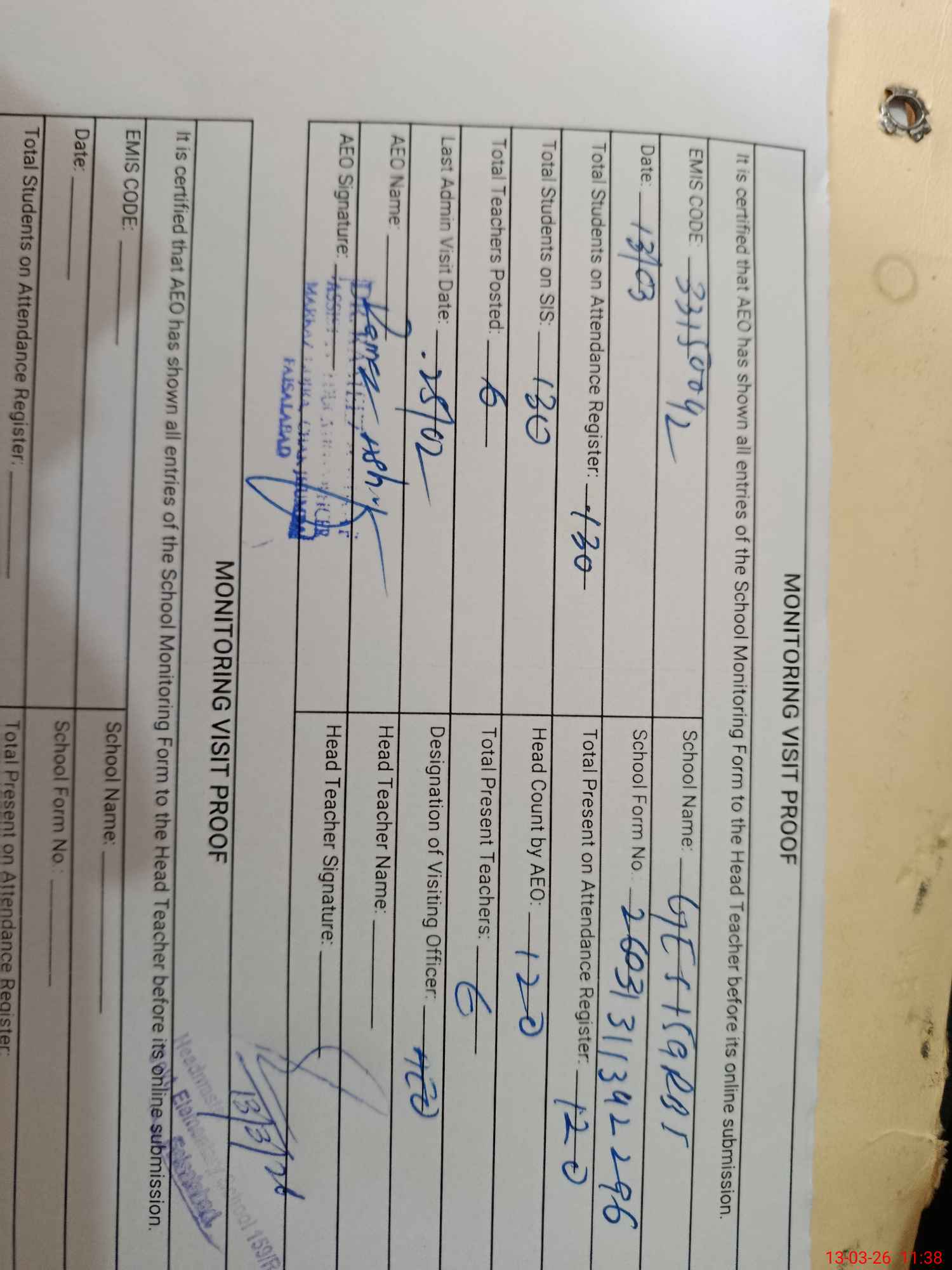 | Attendance Register | Head Teacher | MEA with School | Visit Proof |