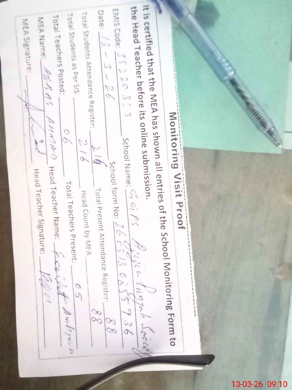| Attendance Register | Head Teacher | MEA with School | Visit Proof |