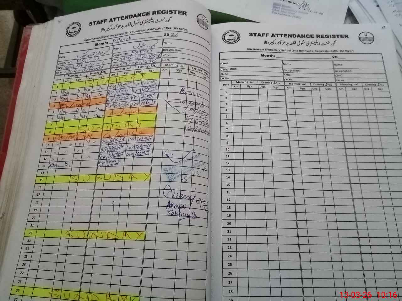 | CNIC | Full Name | Designation | R/C | Absence During Last Calender Month |