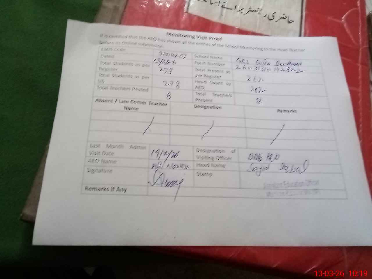 | Attendance Register | Head Teacher | MEA with School | Visit Proof |