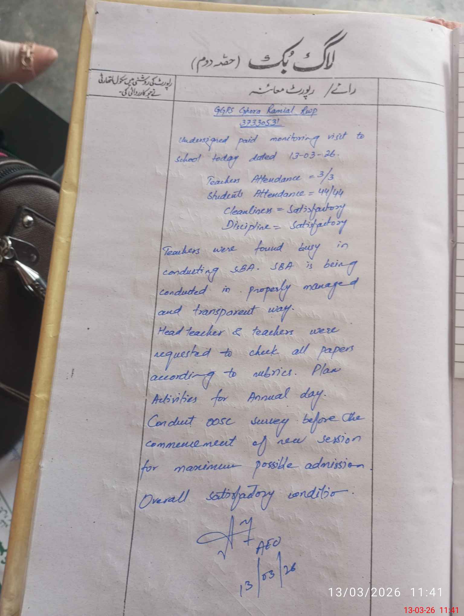 | Certified that this School was Inspected by the Undersigned MEA/DMO Today and the Information Stated Above is as Per Record. | |||||