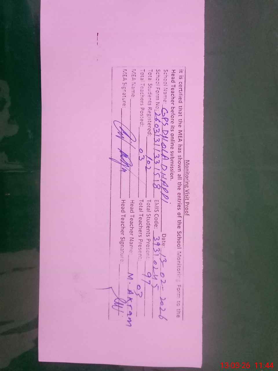 | Attendance Register | Head Teacher | MEA with School | Visit Proof |