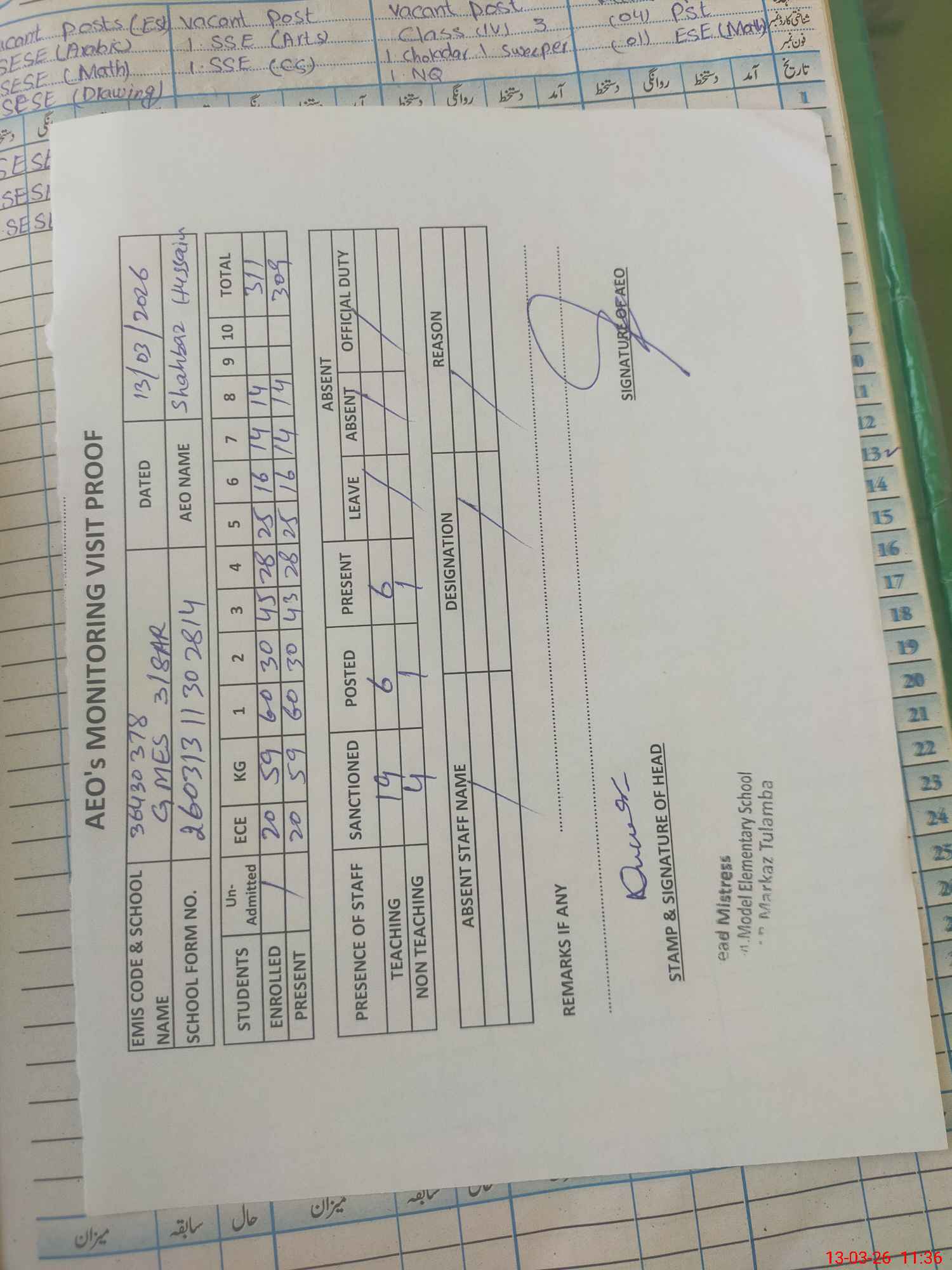 | Attendance Register | Head Teacher | MEA with School | Visit Proof |