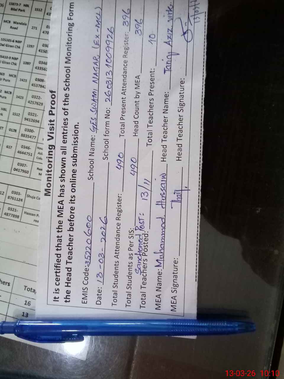 | Attendance Register | Head Teacher | MEA with School | Visit Proof |