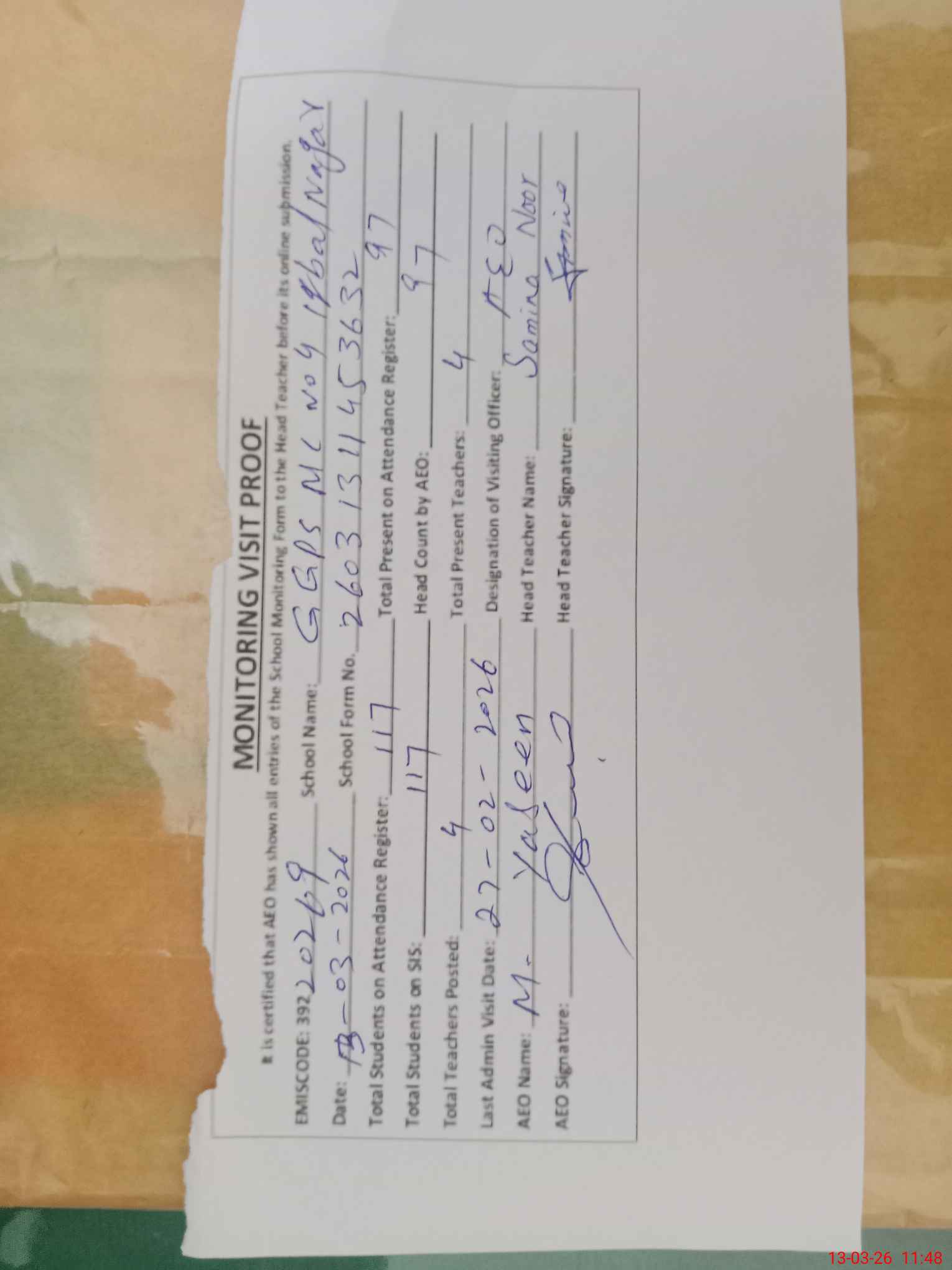 | Attendance Register | Head Teacher | MEA with School | Visit Proof |