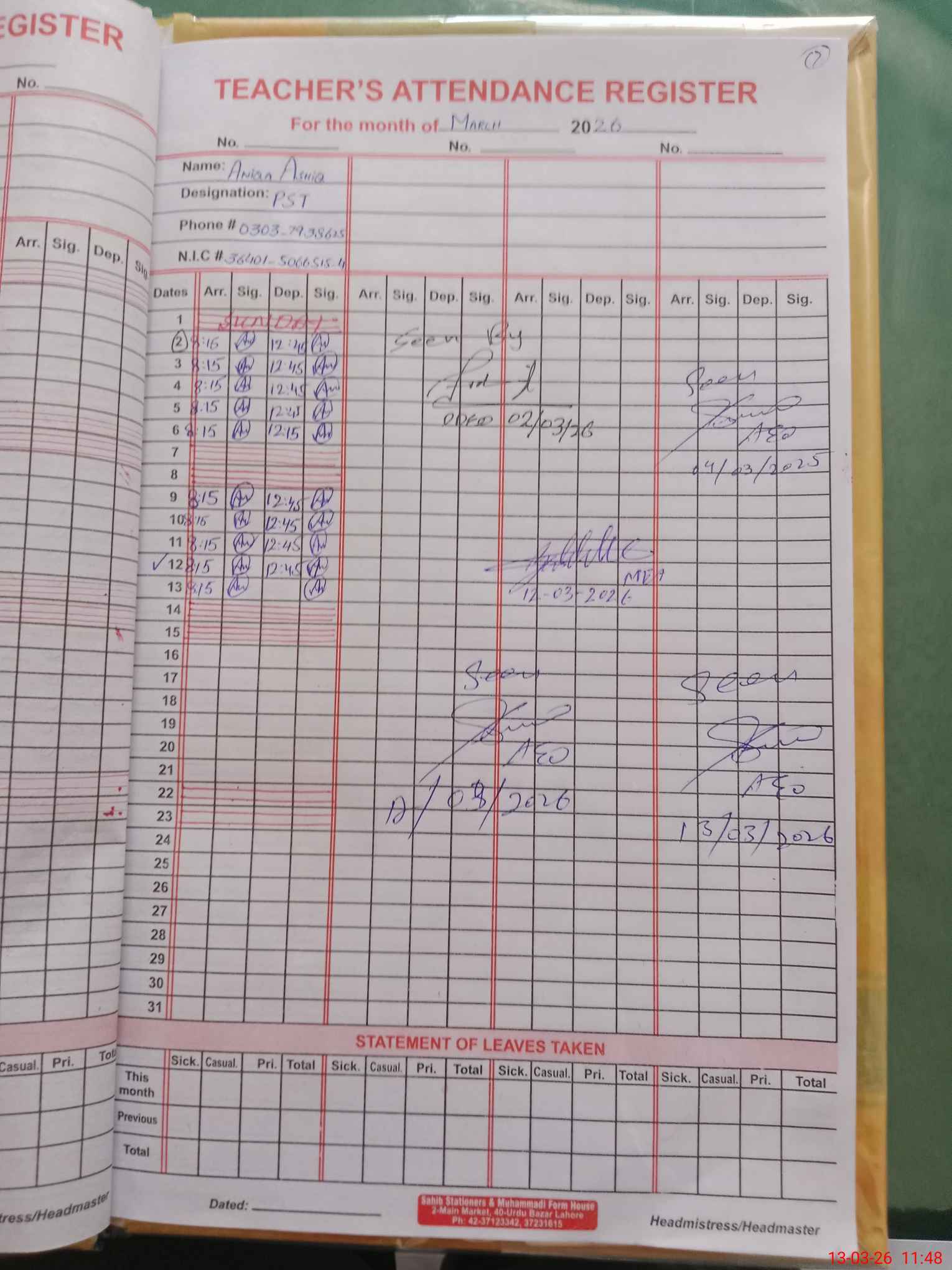 | Name: SA**** NO**** Designation: (School Headmaster's/Headmistress's) PST Phone/Cell Number: 03**** |