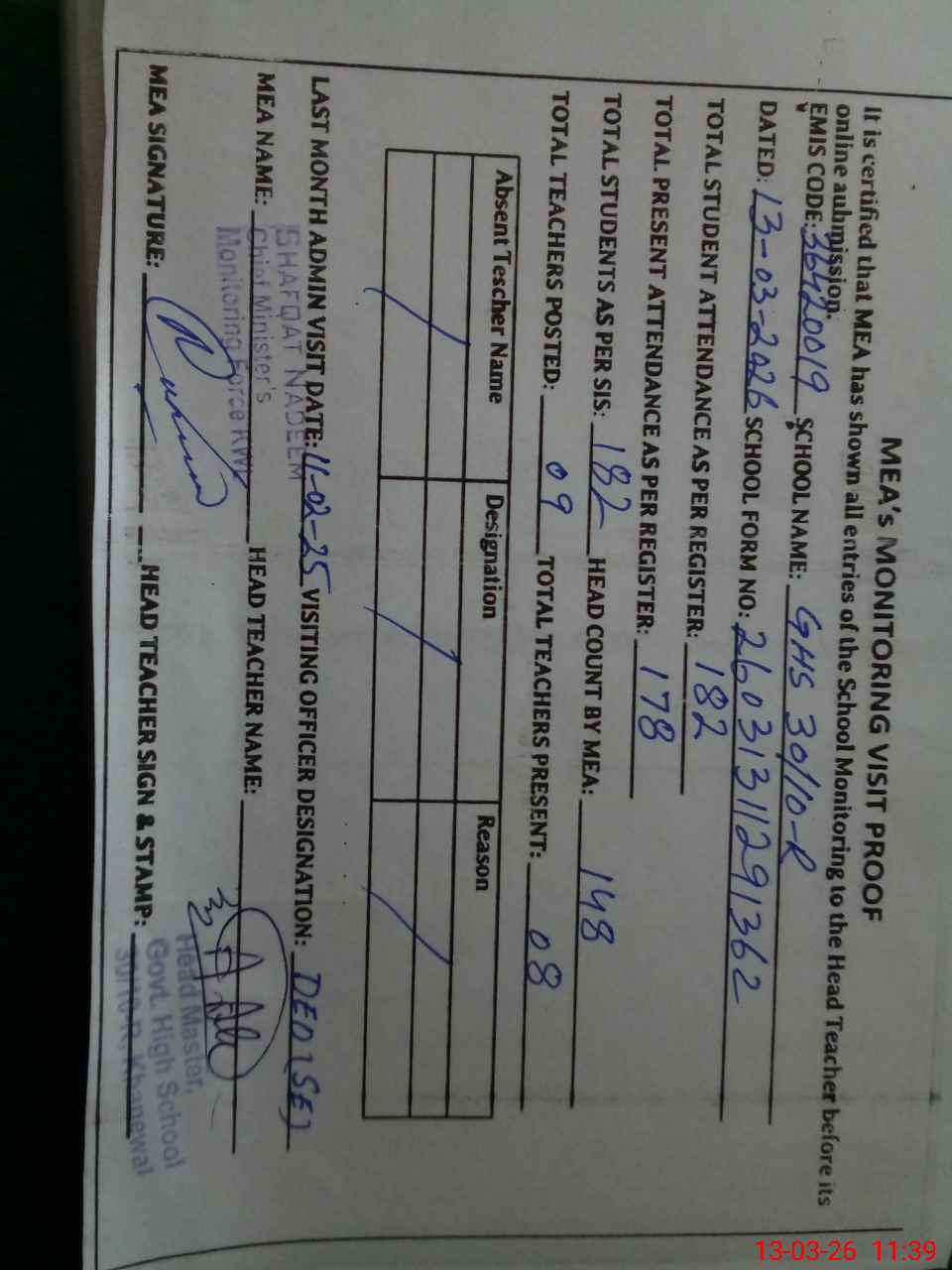 | Certified that this School was Inspected by the Undersigned MEA/DMO Today and the Information Stated Above is as Per Record. | |||||