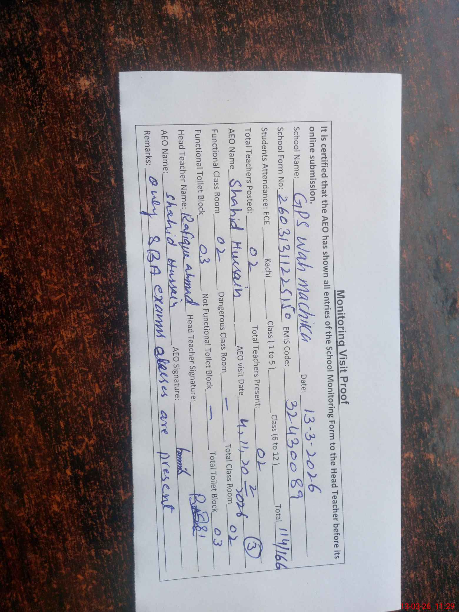 | EMIS Code: 32430089 | Name of School: GPS WAH MACHIKA | |||