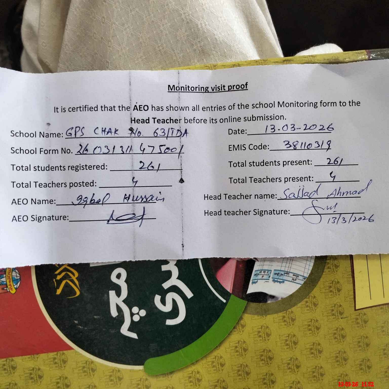 | EMIS Code: 38110319 | Name of School: GPS CHAK NO.63/TDA | |||