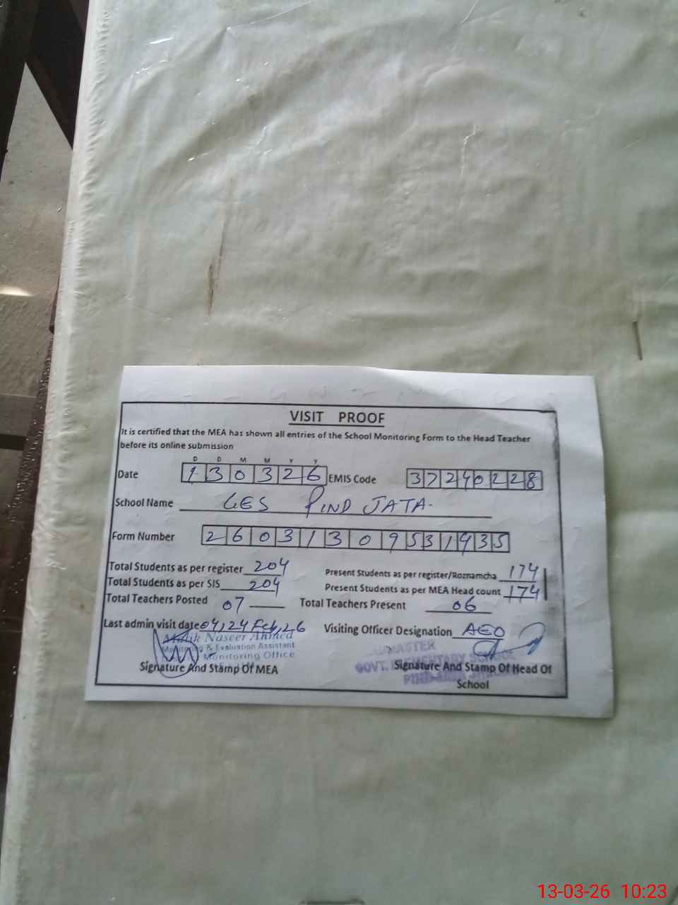 | Attendance Register | Head Teacher | MEA with School | Visit Proof |