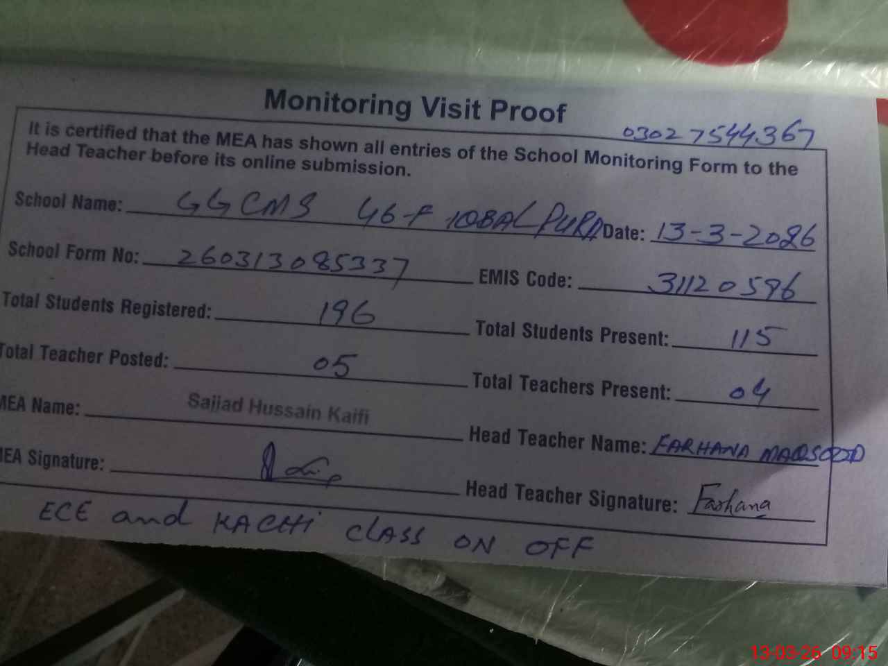 | EMIS Code: 31120596 | Name of School: GGCMS 46/F IQBAL NAGAR | |||