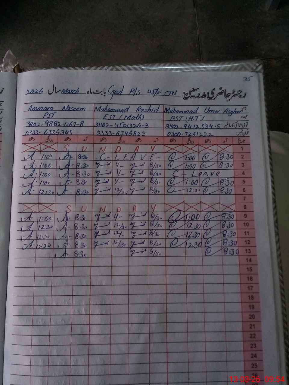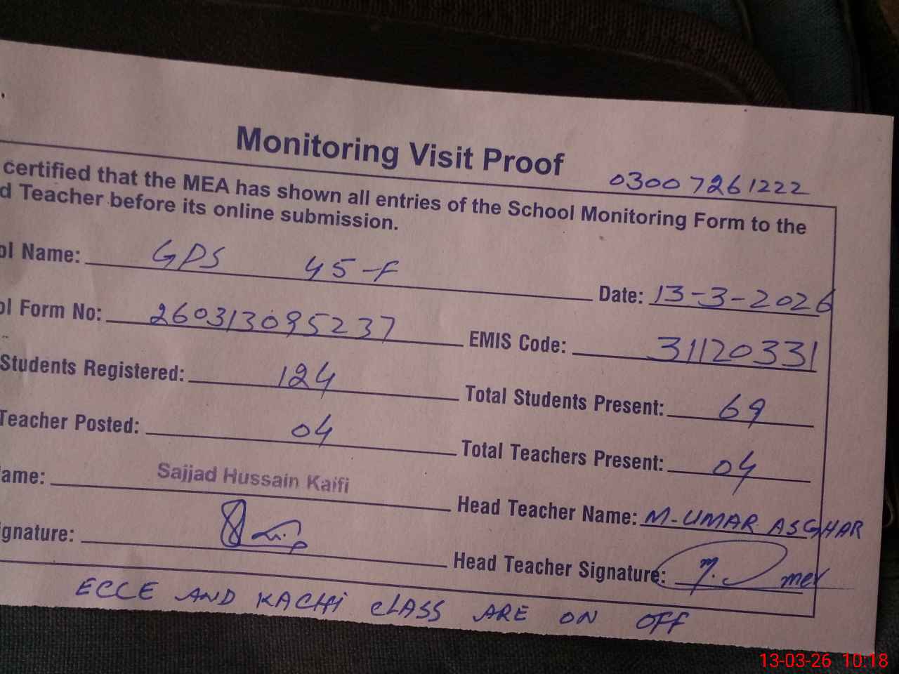| Name: MUM**** AS**** Designation: (School Headmaster's/Headmistress's) PST Phone/Cell Number: 03**** |