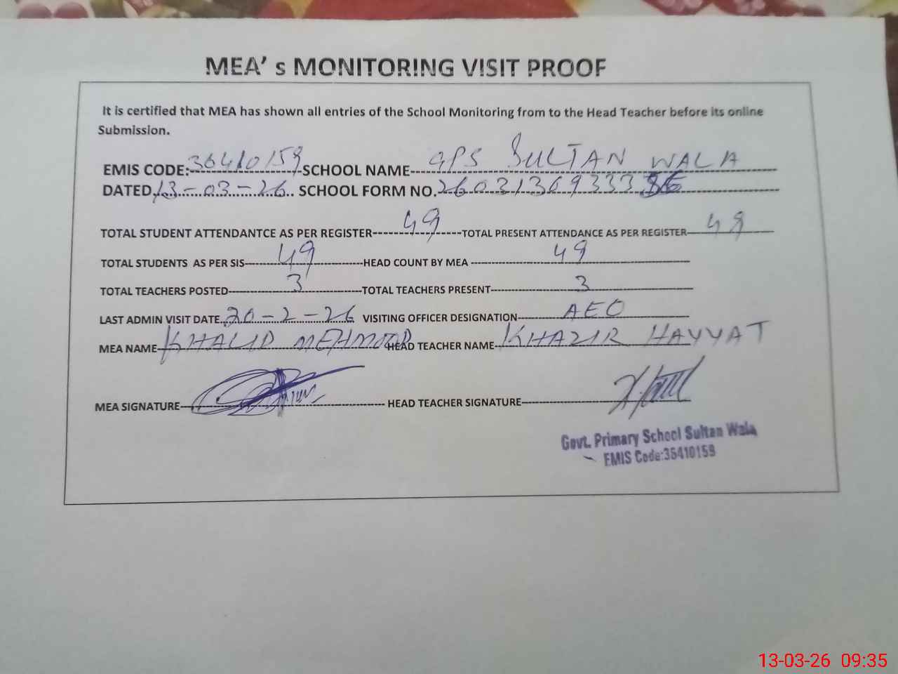 | Attendance Register | Head Teacher | MEA with School | Visit Proof |