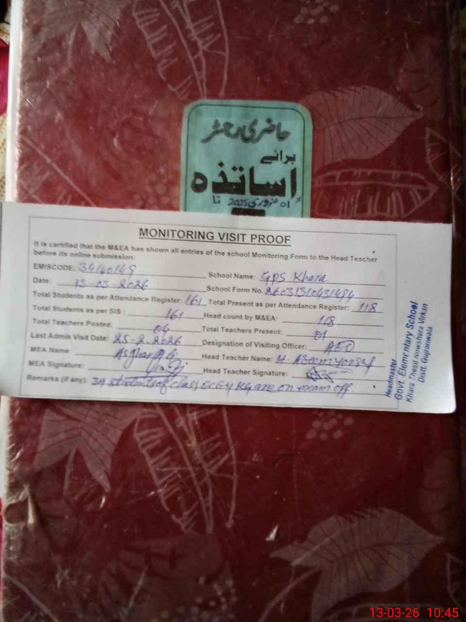 | Attendance Register | Head Teacher | MEA with School | Visit Proof |