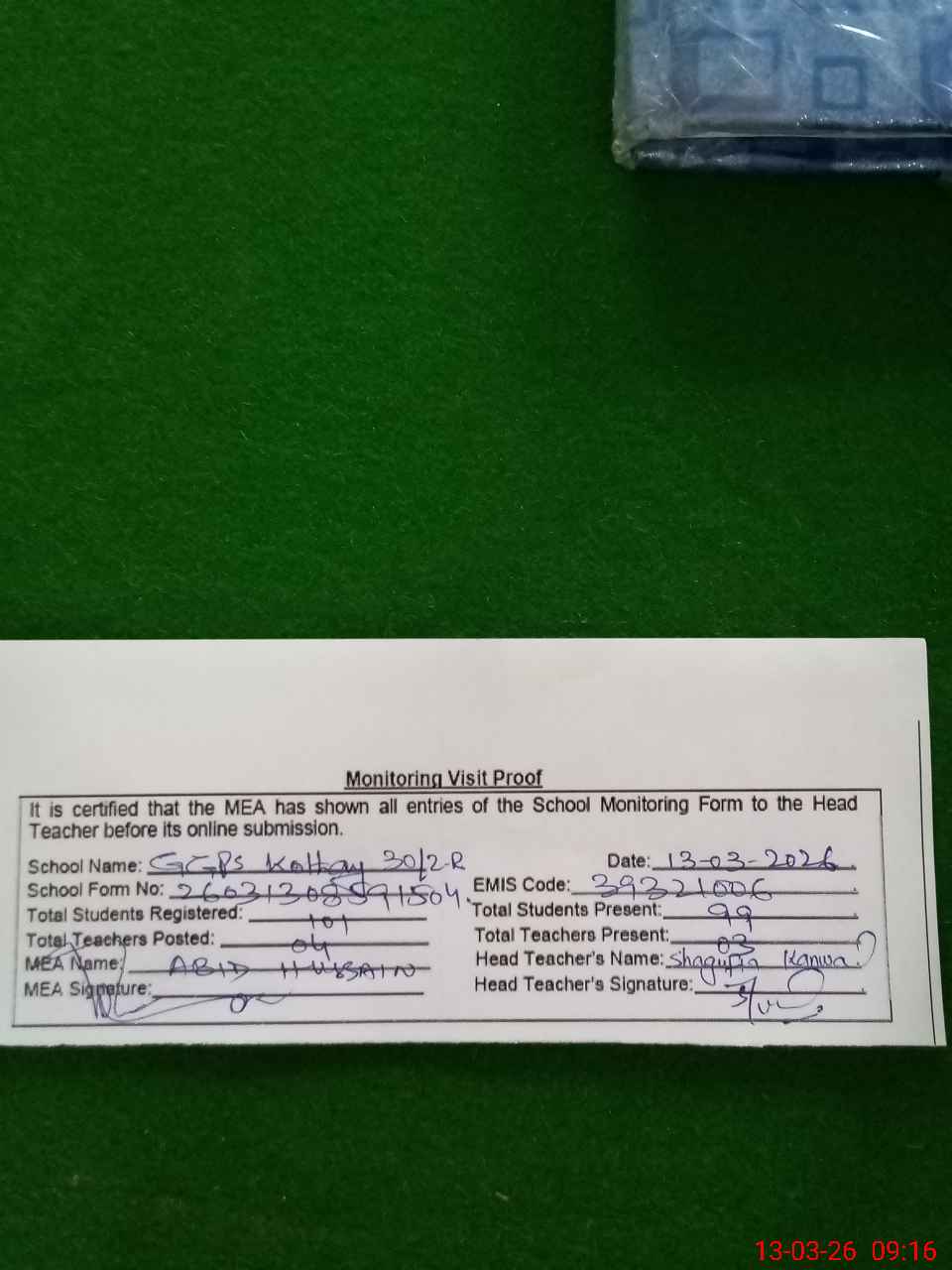 | Attendance Register | Head Teacher | MEA with School | Visit Proof |