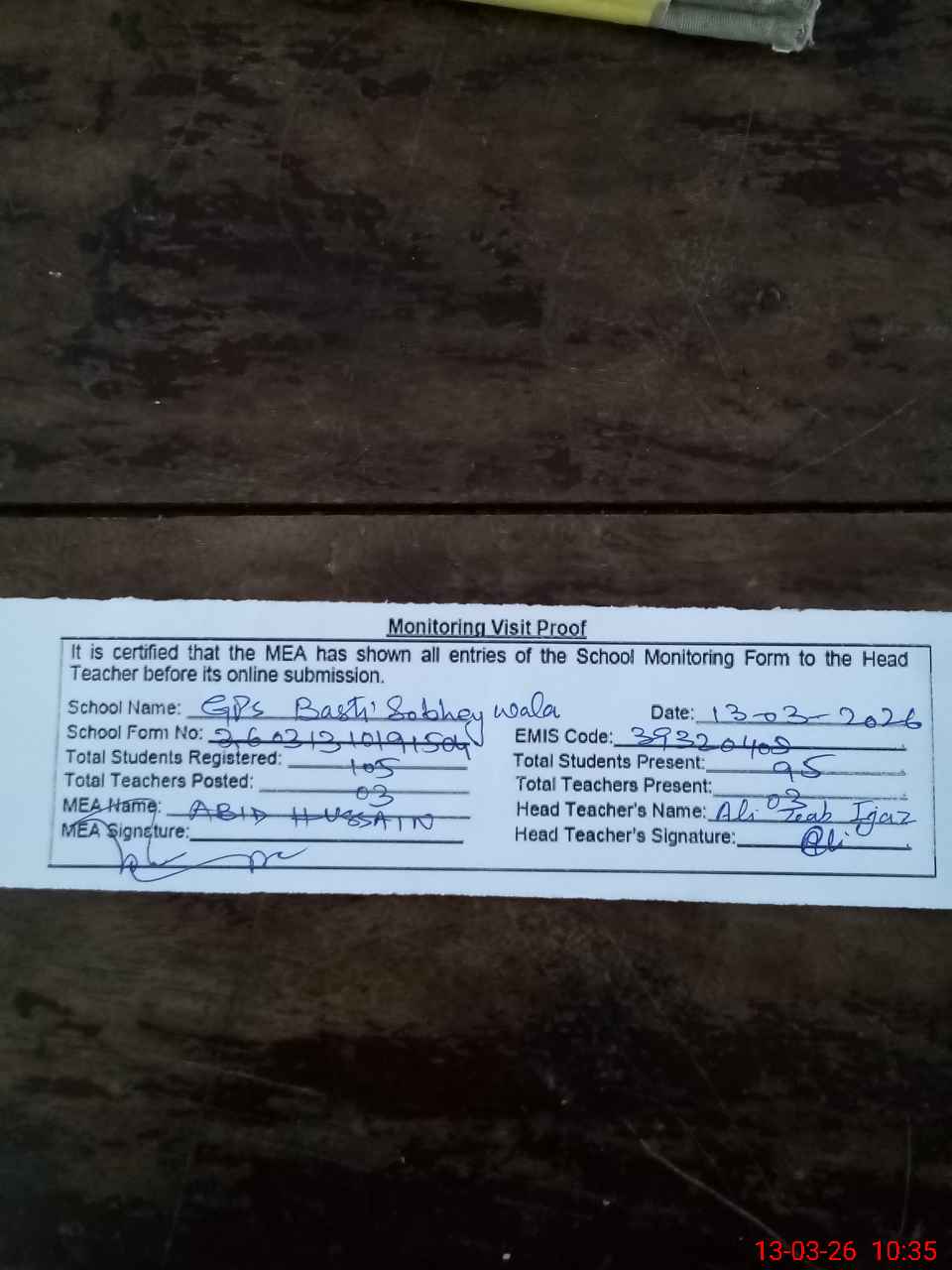 | Attendance Register | Head Teacher | MEA with School | Visit Proof |