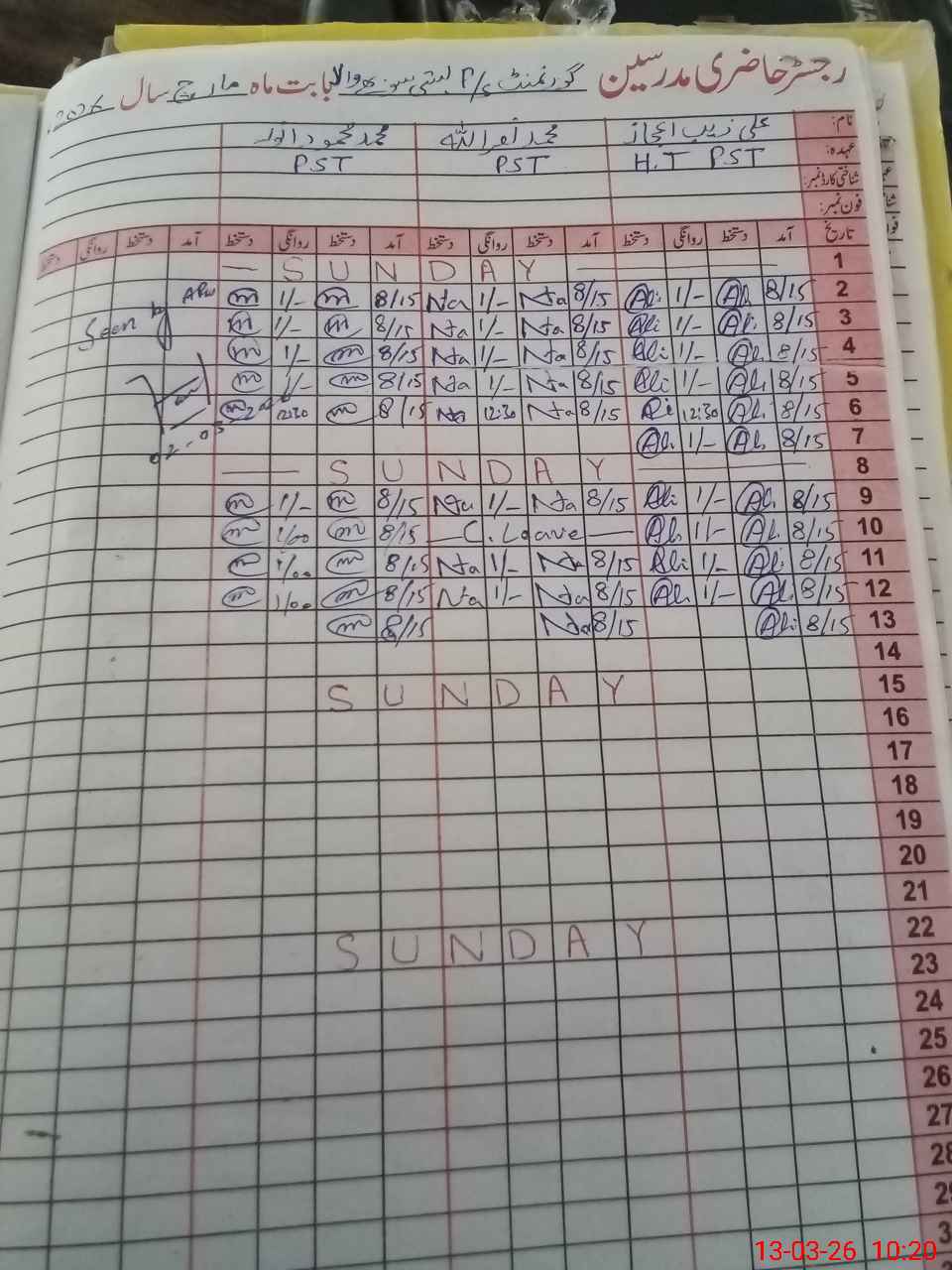 | CNIC | Full Name | Designation | R/C | Absence During Last Calender Month |