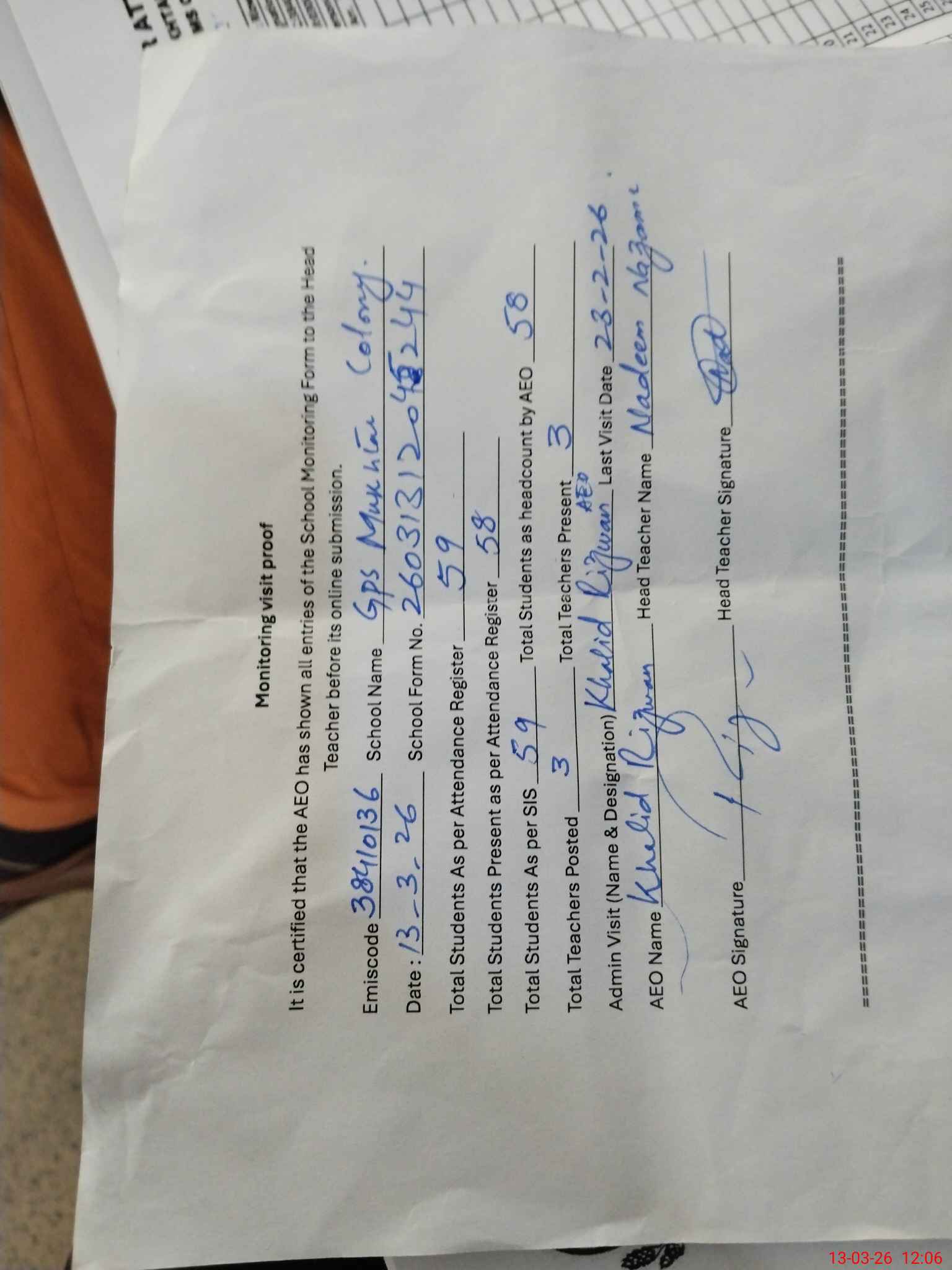 | Attendance Register | Head Teacher | MEA with School | Visit Proof |