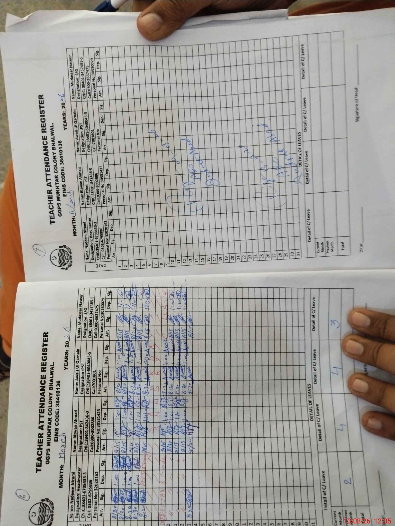 | CNIC | Full Name | Designation | R/C | Absence during last cal. month |