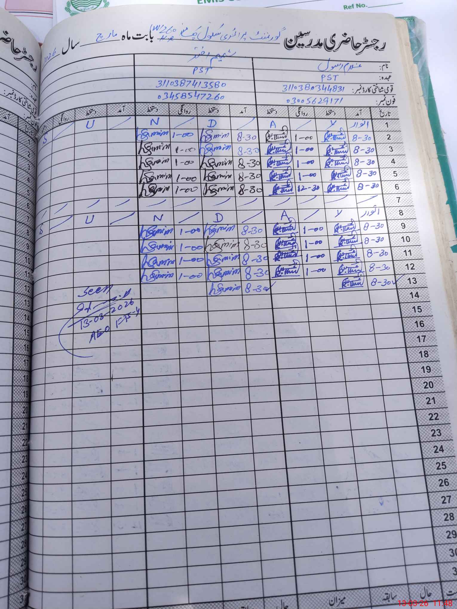 | Name: Sh**** Ak**** Designation: (School Headmaster's/Headmistress's) PST Phone/Cell Number: 03**** |