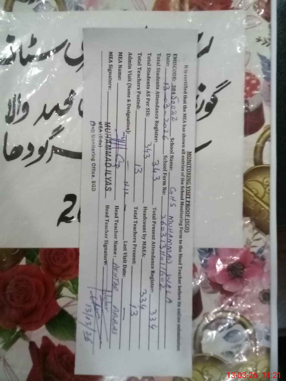 | Certified that this School was Inspected by the Undersigned MEA/DMO Today and the Information Stated Above is as Per Record. | |||||