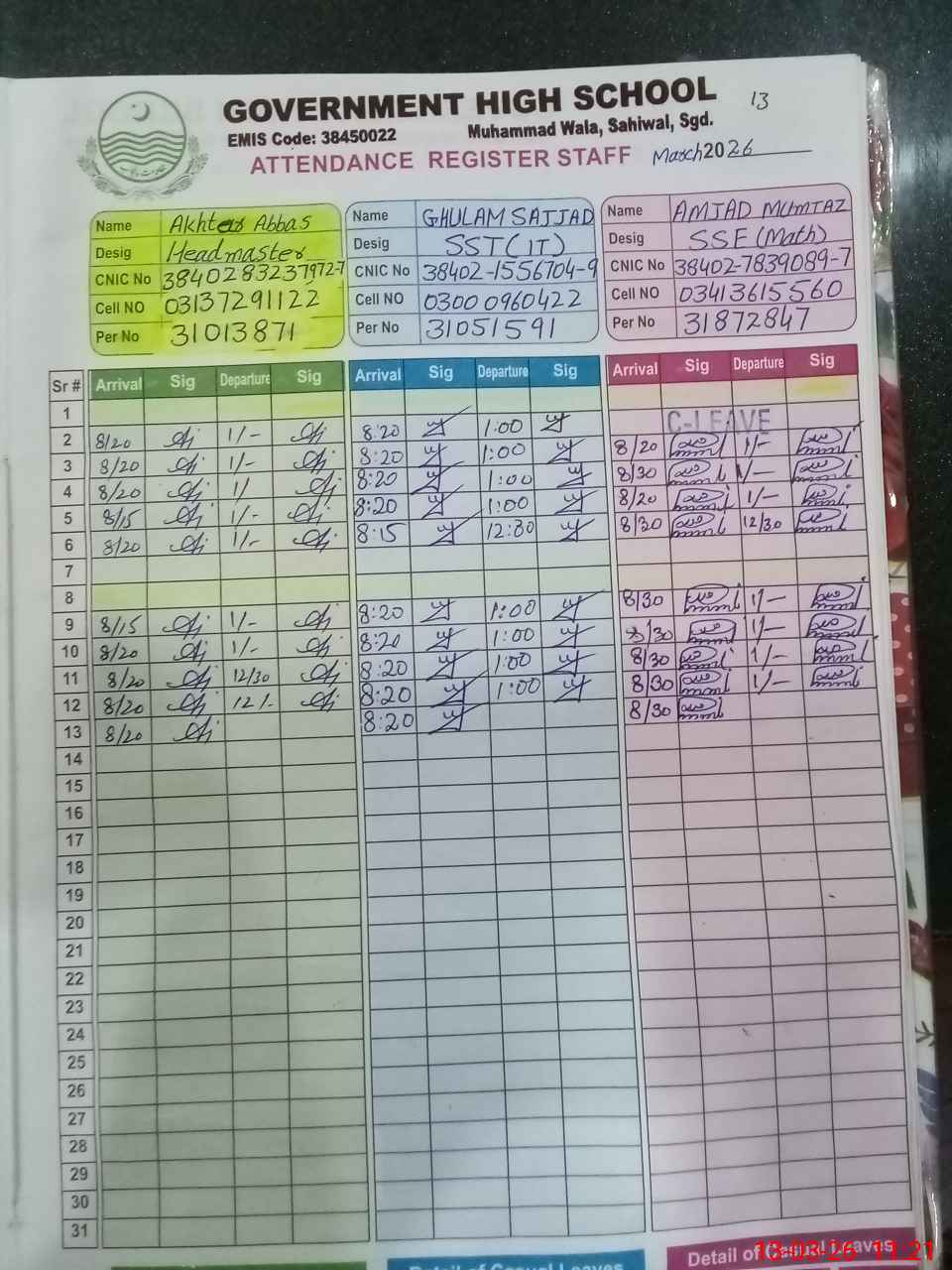 | CNIC | Full Name | Designation | R/C | Absence during last cal. month |