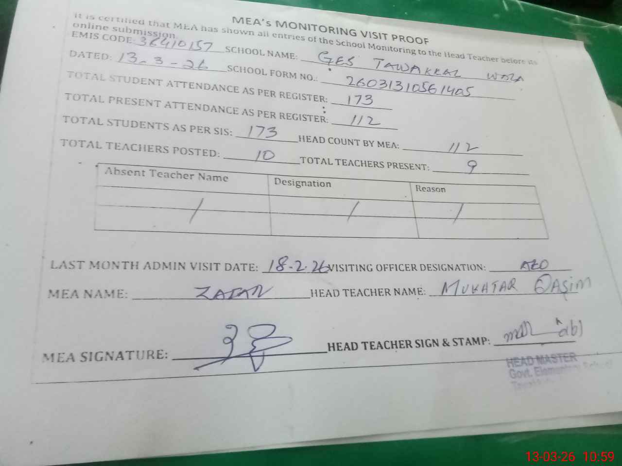 | Attendance Register | Head Teacher | MEA with School | Visit Proof |