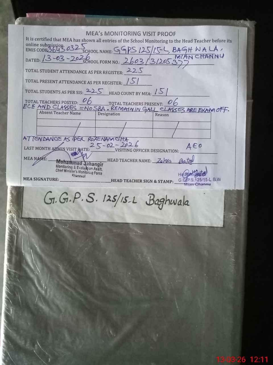 | Attendance Register | Head Teacher | MEA with School | Visit Proof |