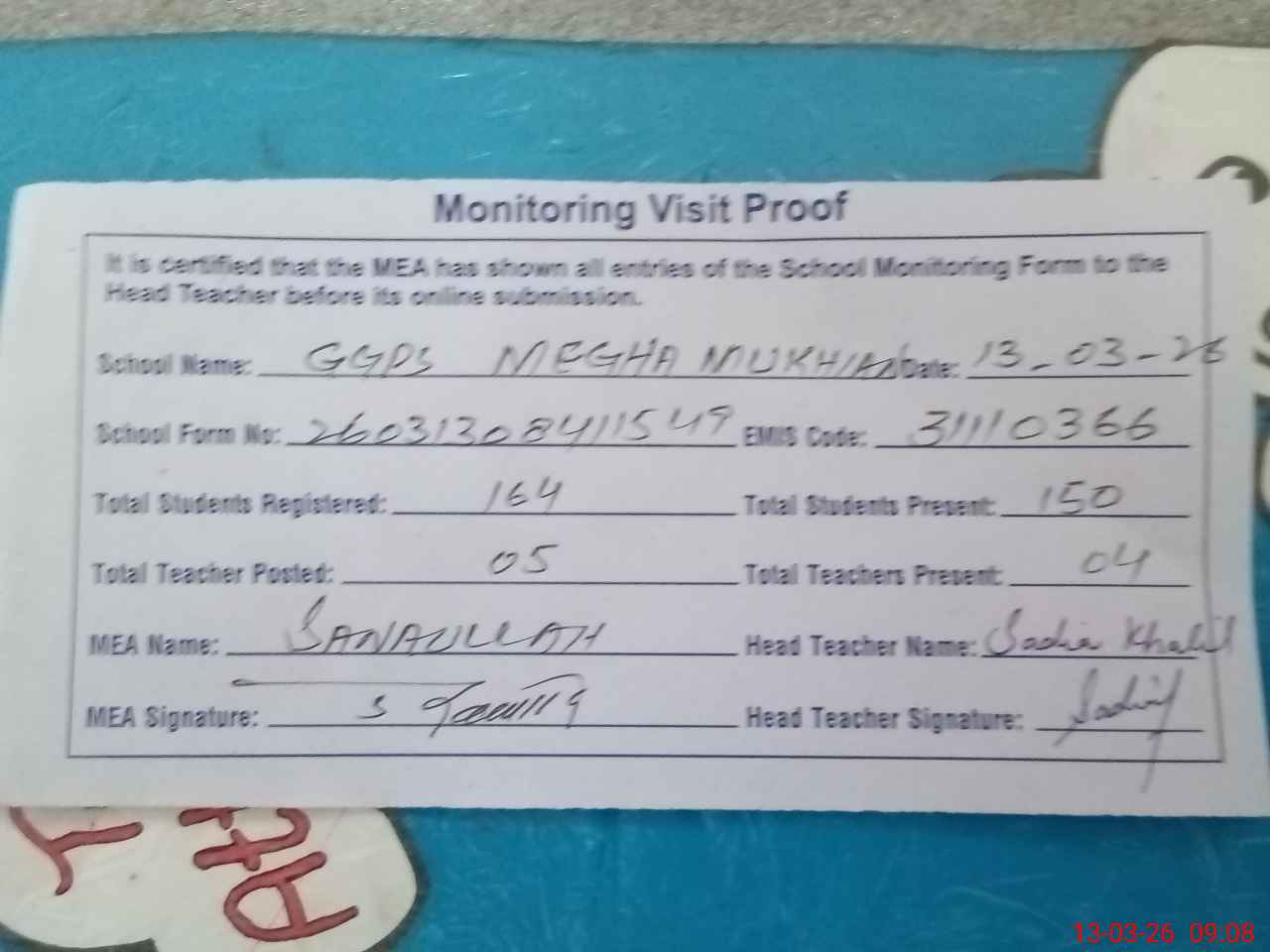 | Attendance Register | Head Teacher | MEA with School | Visit Proof |