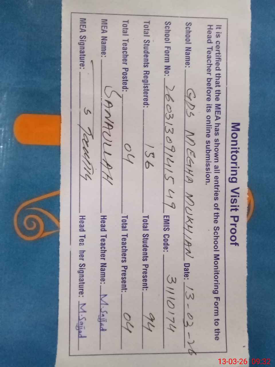 | EMIS Code: 31110174 | Name of School: GPS MEGHA MUKHIAN | |||