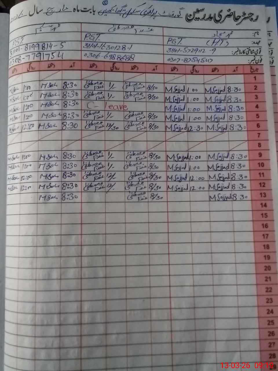 | Name: Mu**** Sa**** Designation: (School Headmaster's/Headmistress's) PST Phone/Cell Number: 03**** |