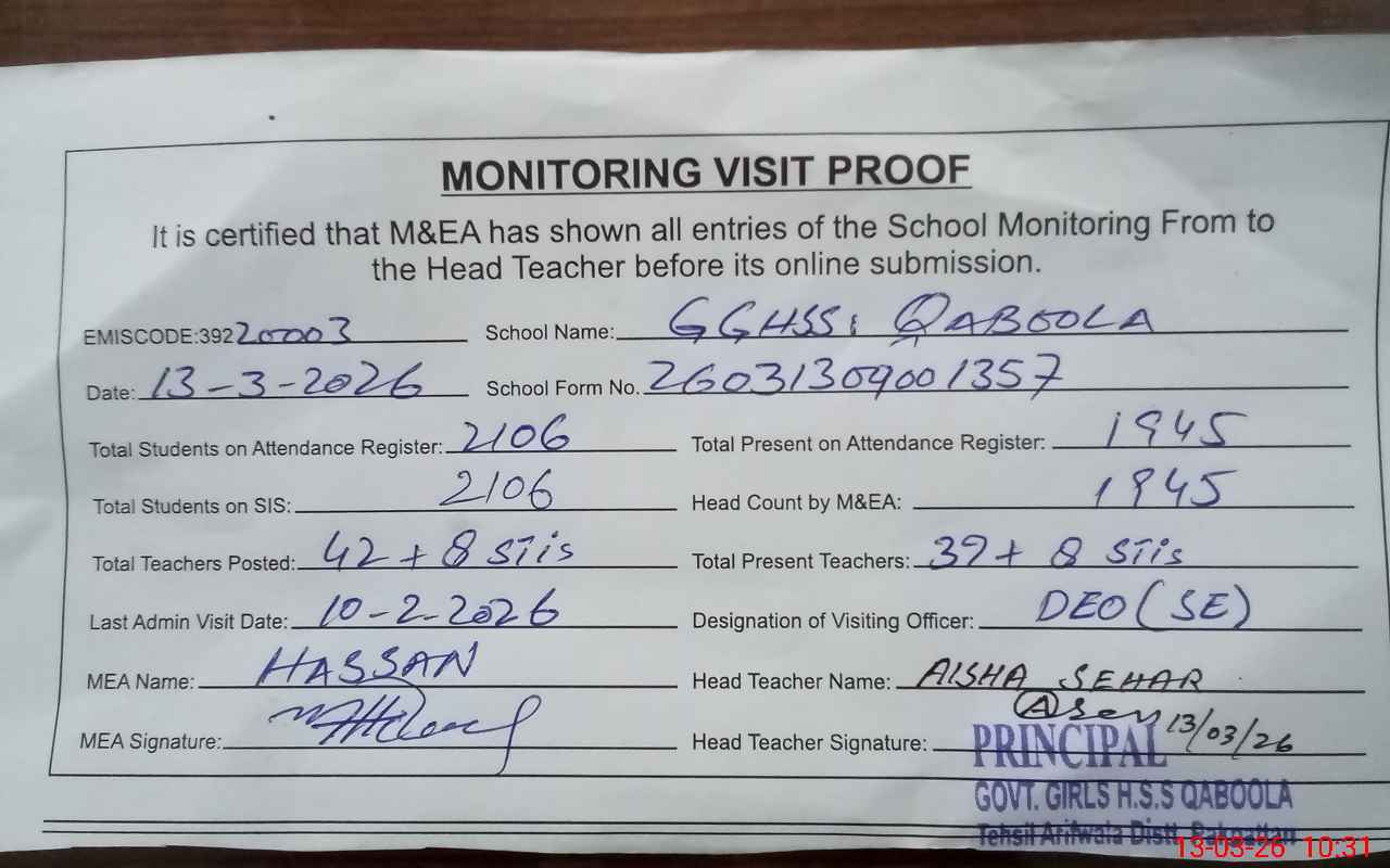 | EMIS Code: 39220003 | Name of School: GGHSS QABOOLA, ARIFWALA | |||