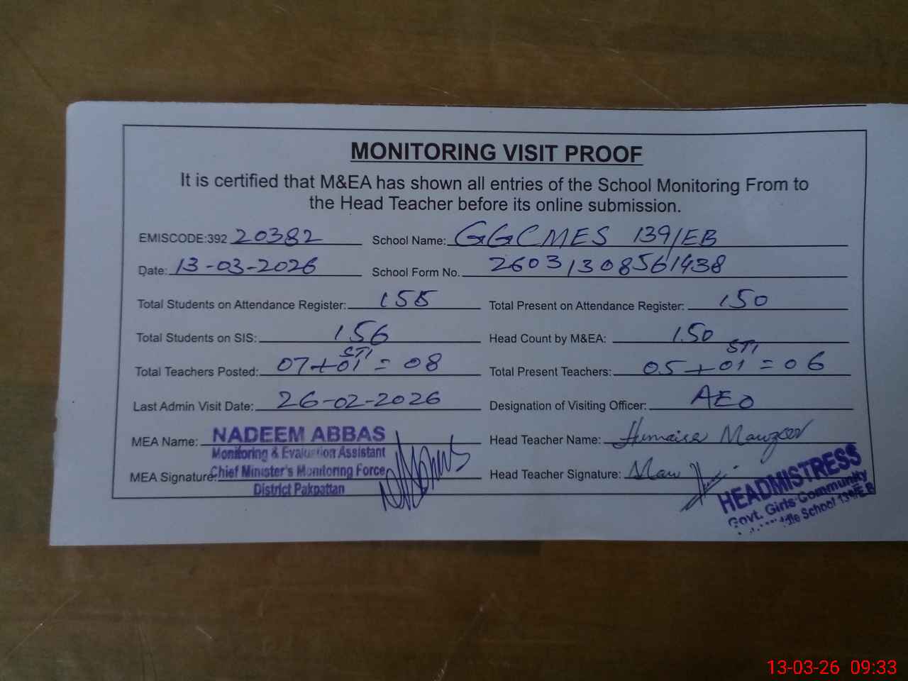 | EMIS Code: 39220382 | Name of School: GGCMES 139 EB ARIFWALA | |||