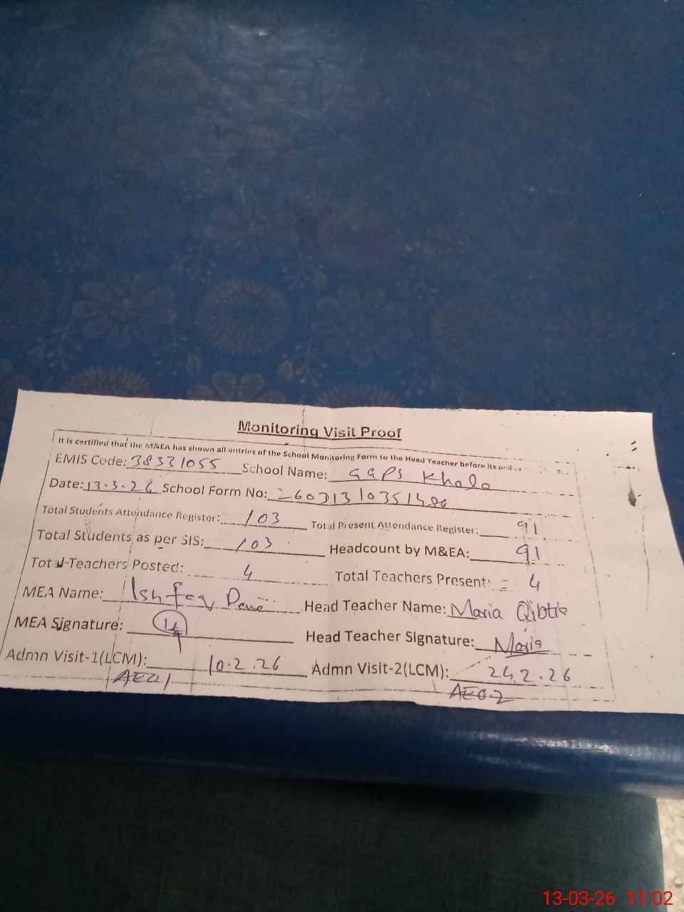 | Attendance Register | Head Teacher | MEA with School | Visit Proof |
