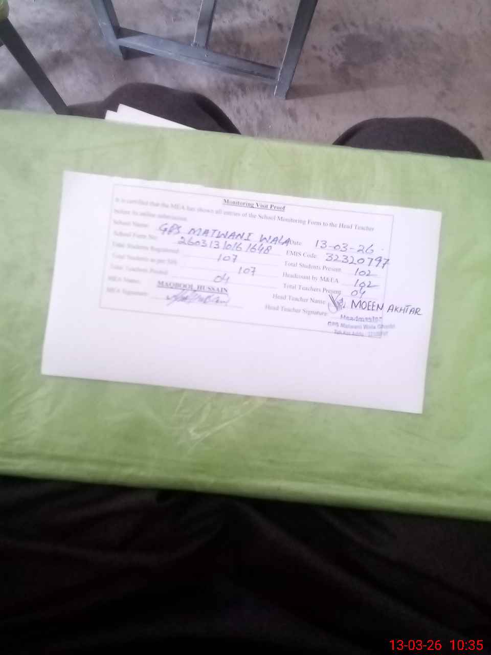 | Attendance Register | Head Teacher | MEA with School | Visit Proof |