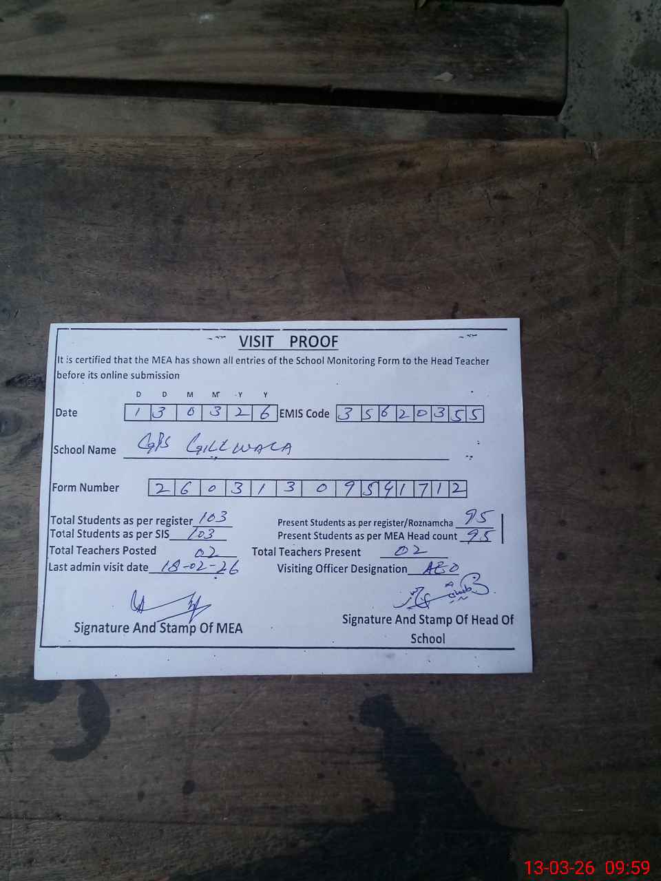 | Attendance Register | Head Teacher | MEA with School | Visit Proof |