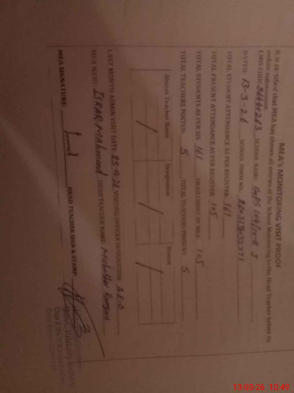 | Attendance Register | Head Teacher | MEA with School | Visit Proof |