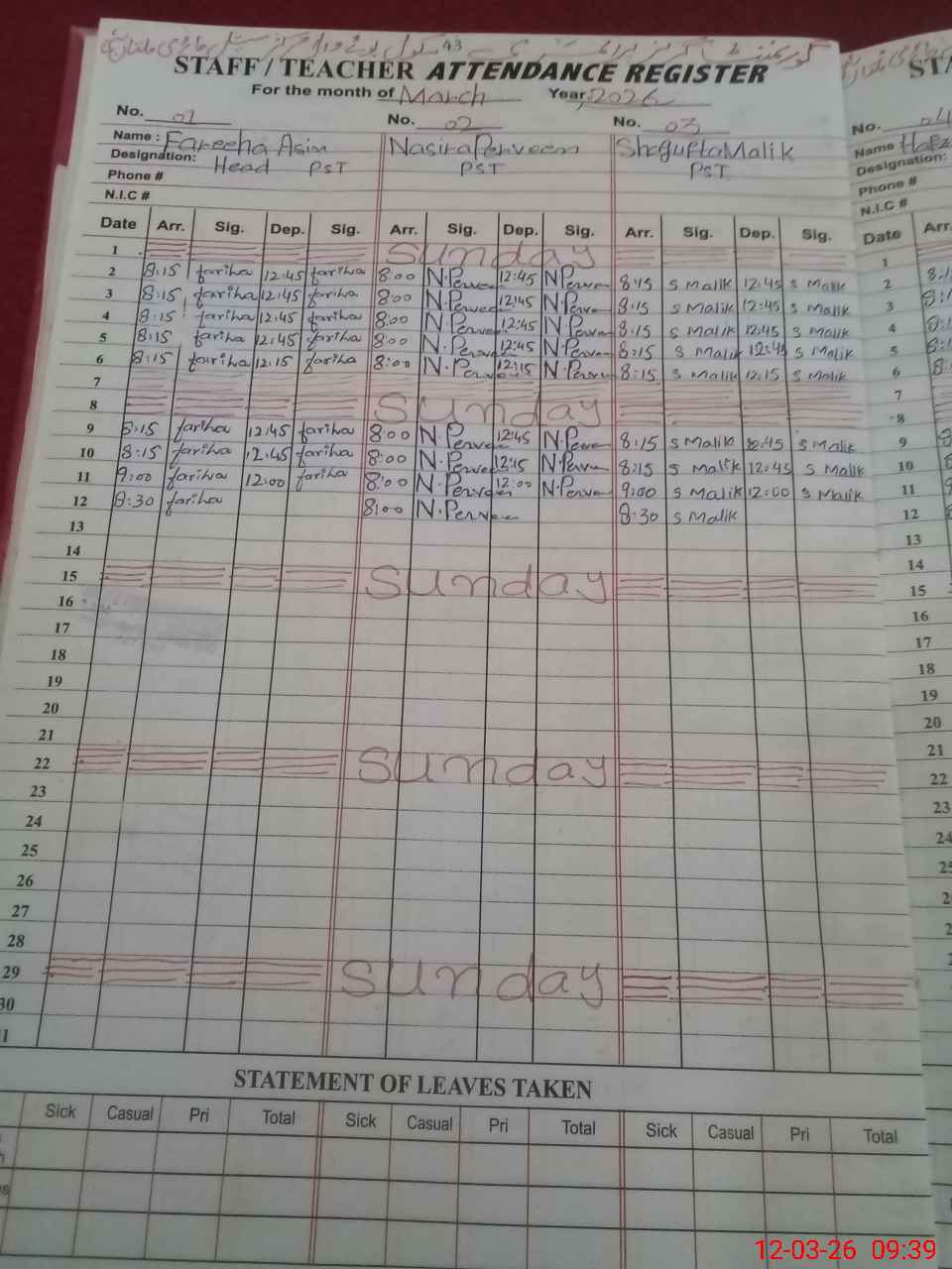 | CNIC | Full Name | Designation | R/C | Absence During Last Calender Month |