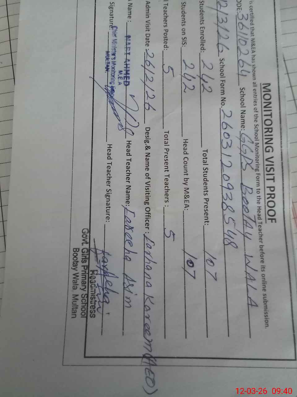 | Certified that this School was Inspected by the Undersigned MEA/DMO Today and the Information Stated Above is as Per Record. | |||||