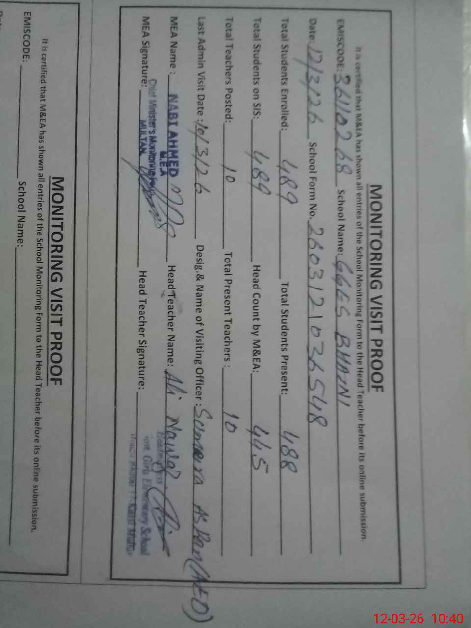 | EMIS Code: 36110268 | Name of School: GGES BHAINI BHUDLA ROAD MULTAN | |||