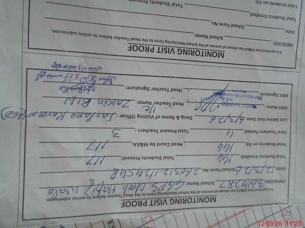 | Attendance Register | Head Teacher | MEA with School | Visit Proof |